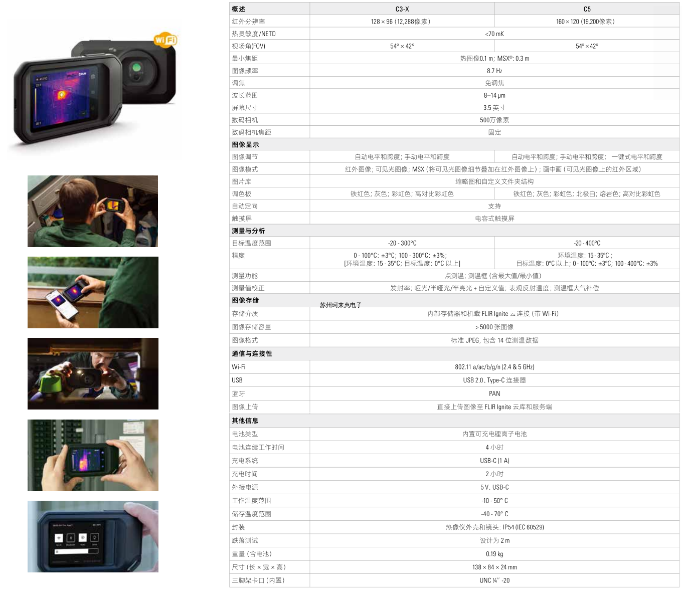 FLIR C3-X使检查潜在问题,记录维修,具有128×96像素热传感器,MSX®(多波段动态成像),500万像素的可见光相机和LED照明,C3-X是一款经济型检测工具,可用于电气/机械,建筑和维修应用。直接上传和储存图像至FLIR Ignite云端,用户可在这里整理和备份文件。与客户实时共享图像,或通过移动设备或电脑创建专业报告。