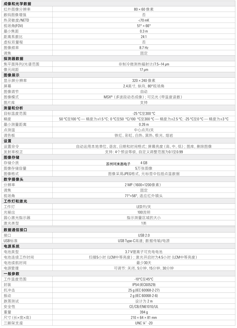 FLIR TG165-X可以帮助您可视化冷热点,这些冷热点可以指示电气故障、机械故障或气体泄漏和水泄漏。这款多功能、非接触式测量和成像工具可在屏幕上显示温度异常,比单点红外测温仪更快检测并发现问题根源。FLIR专利的MSX(专利号:CN201380073584.9)图像增强功能为全红外图像增加了视觉细节,可以清楚看到组件,甚至阅读标签。靶心激光器确保您能正确测量组件,简单易用的按钮和设置助您迅速完成工作,毫无压力。FLIR TG165-X的内部存储容量达50,000张图片,并配备一块可充电的锂离子电池。